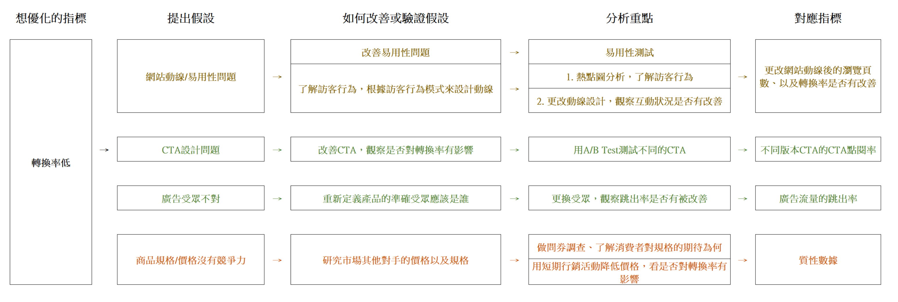 當我透過數據、以及商業情境的研究來了解他的網站後,我會提出多種影響網站轉換率的猜測與假設,並往下進行測試與研究,每一種假設或商業現象,都有對應的指標可以去測量,以轉換率來說我舉幾個例子: